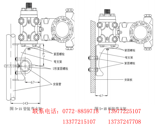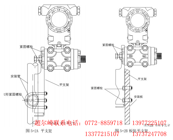 變送器可以安裝在測(cè)量點(diǎn)處,也可以安裝在墻壁上或使用安裝支架(變送器附件)夾拼在哪 2”(直徑約 50mm-60mm)的管道上。變送器的安裝型式主要有:彎支架管裝、彎支架板裝、平支架管裝和板裝三種。如圖 5-1A、5-1B、5-2A、5-2B 所示:(供用戶選擇)