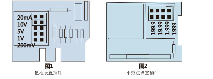 當(dāng)你移到插針上的短路插,就可以得到圖2所示小數(shù)點(diǎn)位置.注: 該儀表出廠時(shí)設(shè)定量程0~10V,相應(yīng)的顯示0~2000,用戶根據(jù)自己的實(shí)際使用情況選擇你所需要的量程和小數(shù)點(diǎn)位置.